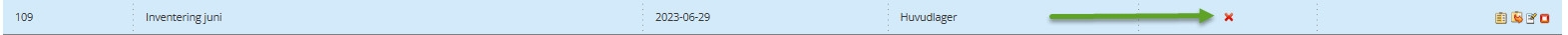 Klicka på det röda krysset för att "checka in" en inventering. Tänk på att datumet som anges är mycket viktigt då inventeringen kommer ta hänsyn till aktuellt lagersaldo vid detta datum.