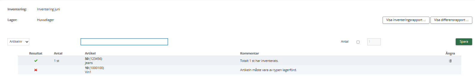 Du kan även ångra en inventerad artikel genom att klicka på soptunnan ute till höger.