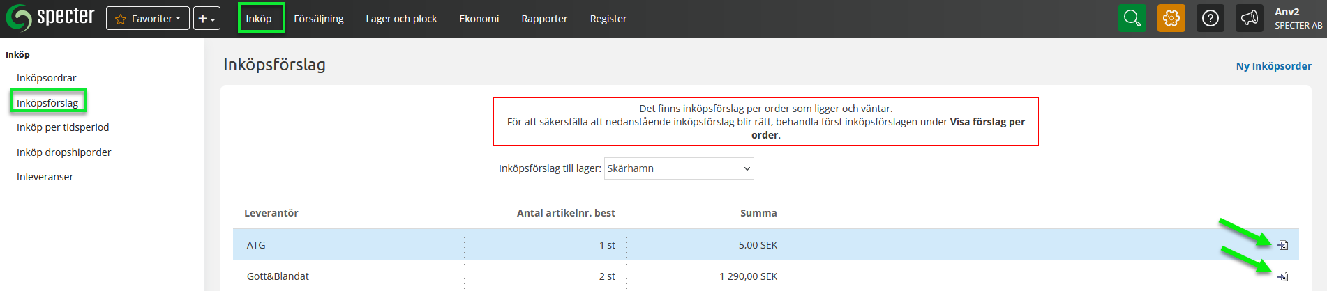 Inköpsförslag visas genom att du går in under Inköp och klickar på "inköpsförslag” i menyn i vänsterkant.