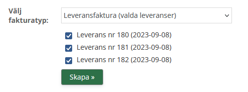 Det här alternativet ska man välja om man gjort flera inleveranser av inköpsordern men endast vill skapa faktura på vissa av dem. Vid detta val får man sedan välja exakt vilka inleveranser man vill skapa lev.faktura på.