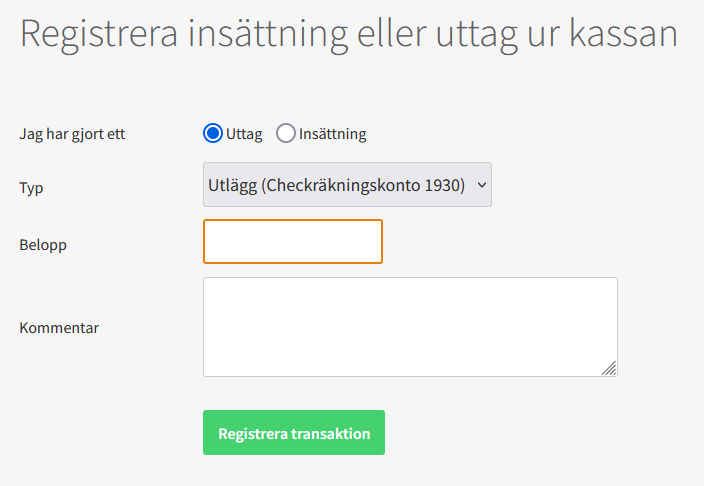 På samma sätt kan du välja att göra ”Uttag” för att ta ut kontanter till diverse utgifter företaget kan tänkas få.