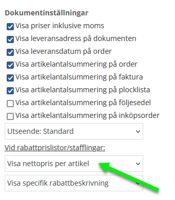 Det går att välja om det ska visas nettopris på artikeln eller grundpris + rabatt. (görs under systeminställningar i affärssystemet och slår igenom i både kassan och resterande delar av affärssystemet).