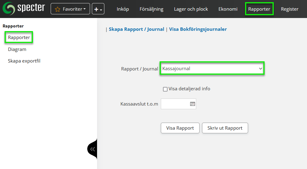Kassajournalen visar dagsavsluten för kassan/kassorna under vald period.