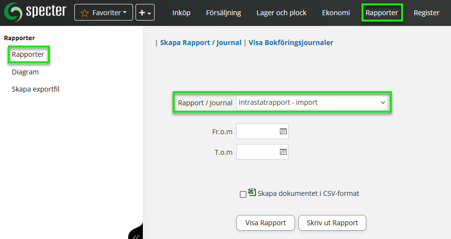 En intrastatrapport kan man ta fram över inlevererade inköp från leverantörer inom EU, från vilka man har importerat varor. Man tar ut intrastatrapporten över en period och den hämtar information från inleveranserna i Specter.