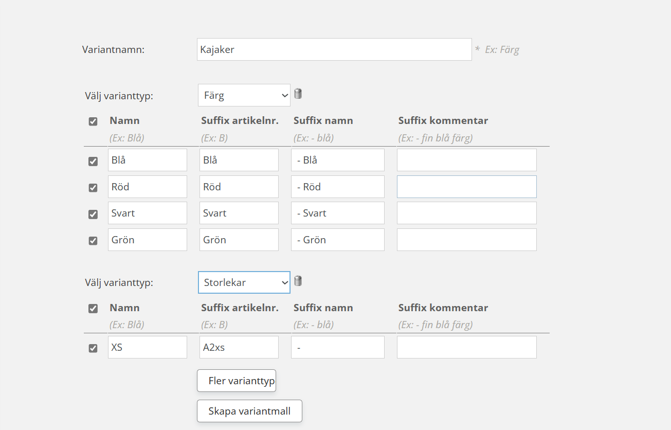 Nya variantmallar läggs upp under Artikelregistret- Varianter. Till en variantmall kopplas en eller flera varianttyper.