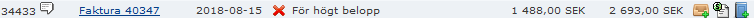 Om det inkommit en över-inbetalning kan man enkelt boka bort det överstigande beloppet genom att skapa ett verifikat och styra hur det skall bokföras. Nedan exempel visar en inbetalning på 2693 kr varav 1488 kr är överbetalt.