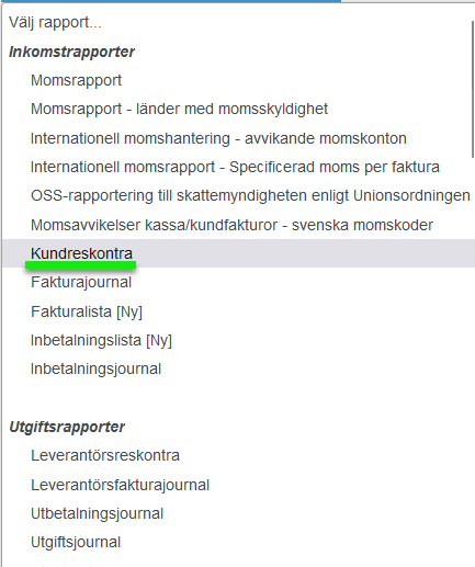 Kundreskontran tar ni ut via rapporter/rapporter övre/vänster meny därefter väljer ni kundreskontra i rullistan.