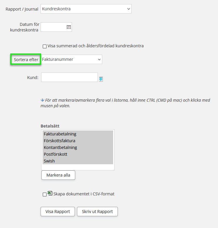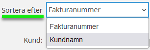 Rapporten kan även sorteras på antingen fakturanummer eller kundnummer