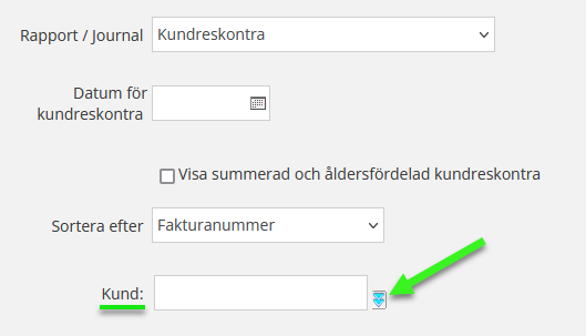 Finns det behov att skicka kontoutdrag på förfallna fakturor till en kund kan den aktuella kunden väljas i rullistan.