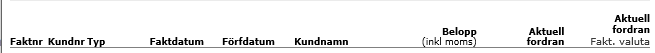 Ni väljer ett datum för kundreskontran och kan även välja betalsätt. Rapporten kan genereras till Excel genom att rutan för "Skapa dokument i Excelformat" bockas i. I Excel kan man sedan bl.a. filtrera och summera per valuta. Rapporten kan även visas i form av åldersfördelning av förfallna och ej förfallna fakturor, något som efterfrågas i samband med bokslut.