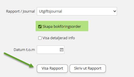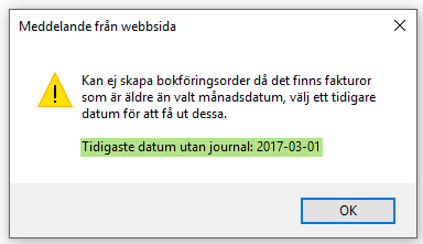 Om du skapar en journal t.om ett datum och systemet upptäcker att det finns utgifter i en tidigare period som ännu inte är journalförda så säger systemet ifrån och ber dig gå tillbaka för att ta det datumet där de utgifterna finns. Då väljer man det datumet eller den sista dagen i den månaden för att få fram de utgifter som inte är journalförda. Det kan till exempel vara utgifter som lagts till efter det att journalen för den perioden skapades och då måste ytterligare en journal tas fram för att få med de utgifterna i bokföringen.