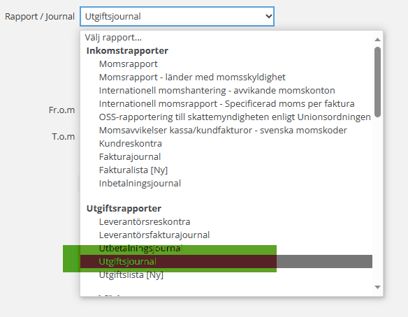 För att ta ut en utgiftsjournal så klickar du på Rapporter i övre menyn, Rapporter följt av att du väljer "utgiftsjournal" under rubriken inkomstrapporter i dropdown-menyn.