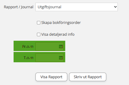 För att titta på, utan att skapa, en utgiftsjournal, dvs alla utgifter under en viss period så fyller du i datumintervallen fr.o.m och t.o.m. Knappen "Visa detaljerad info" bestämmer om du vill visa en detaljerad konteringsinformation för varje utgift i journalen, dvs vilka konton som utgiften berör.