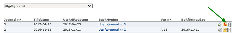 För att bokföra utgiftsjournalen i ett senare skede så klickar du på "Rapporter/Journaler" i vänstermenyn följt av "Visa bokföringsjournaler" i den övre menyn. Där kan du sedan välja "Utgiftsjournaler" i dropdown-menyn och i översikten som då visas ser du om en utgiftsjournal är bokförd (skapad som ett verifikat) eller ej. Om ikonen visas så är journalen bokförd vilket också syns i kolumnen för "Ver nr" och "Bokföringsdag" och om ikonen