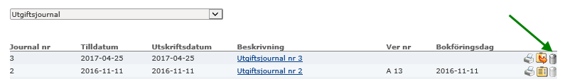 Den sist skapade journalen kan tas bort så länge den inte är bokförd. Det gör ni via soptunnan längst till höger.