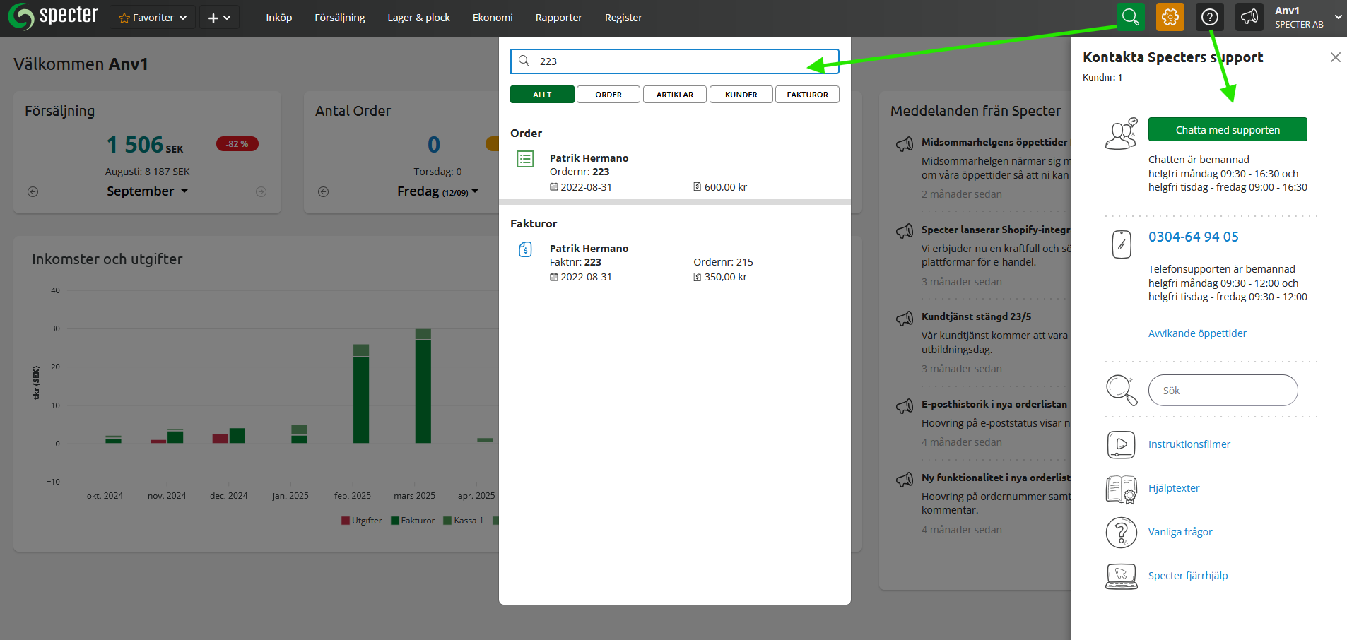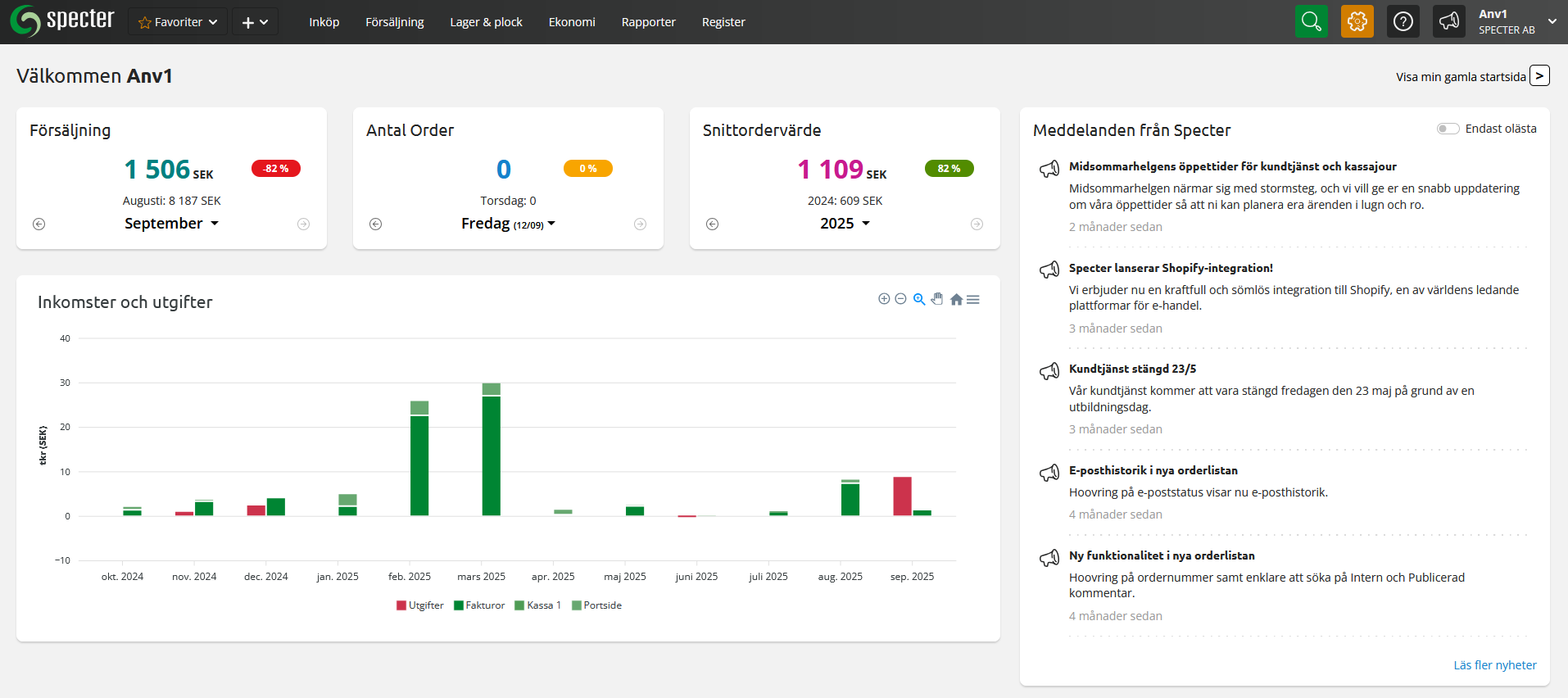 Till höger på startsidan ser ni meddelande från Specter. Exempel på information som visas där är: Nya uppdateringar/funktioner, meddelande från vår supportavdelning osv.