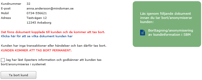 Om det finns dokument kopplade till kunden kommer även dessa att tas bort. En varning kommer visas med röd text i systemet.