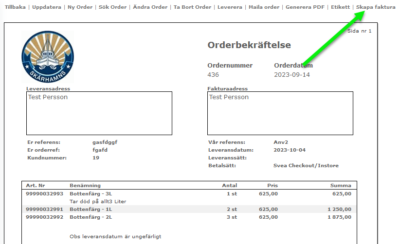 Man kan fakturera ordern när orderbekräftelsen är i visningsläge. Valet skapa faktura finns i övre menyn. För att komma till visningsläget, klicka först på order (här: 125) för att se orderbekräftelsen.