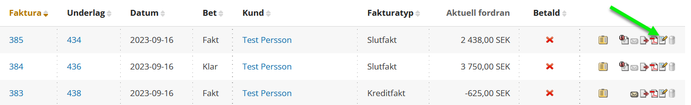 Det går enkelt att flytta fram ett förfallodatum på en kundfaktura. Sök upp fakturan och klicka på följande ikon