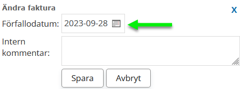 I rutan som visas kan datum ändras samt en intern kommentar kan anges. Glöm inte att spara när ändringen är gjord.