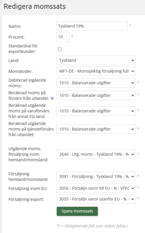 - Om orderradens momssats redan är upplagd i Specter för orderns leveransland, kopplas orderradens moms till momslandet.