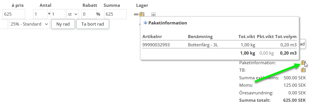 Hovra eller klicka på antekningsblocket för att se vikt och volym för ert inköp.