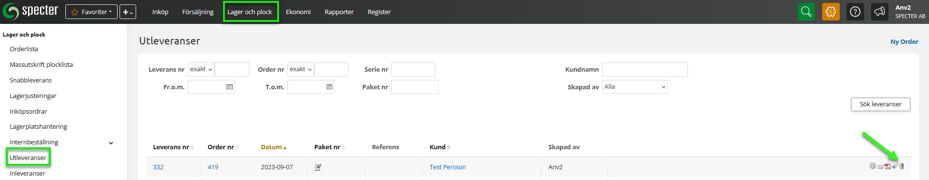 För att söka upp önskad leverans klicka på "Lager och plock" i övre menyn och sedan "Utleveranser" i vänster meny.