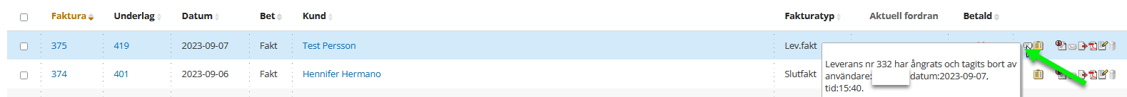 Finns det en faktura på leveransen kommer det skapas upp en intern kommentar i fakturavyn som hänvisar till vem och när leveransen ångrades. Utlevererade artiklar kommer återföras till lagret när leveransen ångras.